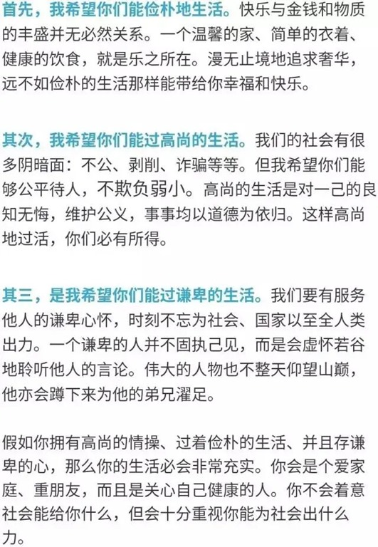 这是一个利益在前,道德在后的时代:金钱、地位、权力,已经成为世人追逐的唯一之物,道德和价值观的培育,却渐渐被人遗忘。壁立千仞,无欲则刚。但愿你们不要让利益掩盖良心,以厚德载物自许。我们所追求的,理应是较名与利更能持久的东西。