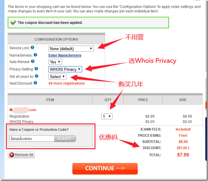 4,输入Namesilo优惠码:linuxhowto 或其它优惠码:LX456、LX888、BY345,可以优惠1美元。需要注意的是,同一账号多次购买域名,优惠码会无效。